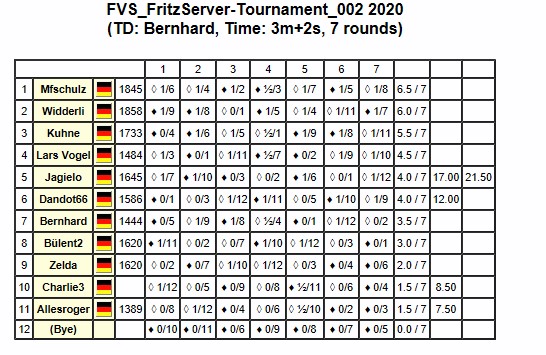 Da der Spielbetrieb aufgrund der Corona-Beschränkungen momentan unterbrochen ist, wurde am 30.03.2020 auf dem FRITZ-Server ( https://play.chessbase.com/de/ ) ein Online-Blitzturnier mit der Bedenkzeit von 3 Minuten + 2 Sekunden Bonus durchgeführt. 12 Schachfreunde nahmen am diesem 2. Online-Turnier der FV Schach teil.