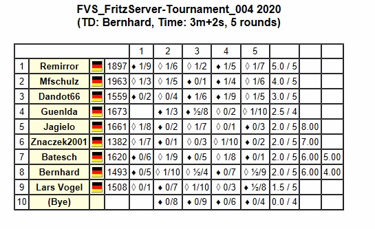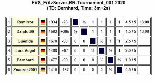 Da der Spielbetrieb aufgrund der Corona-Beschränkungen momentan unterbrochen ist, wurde am 13.04.2020 auf dem FRITZ-Server ( https://play.chessbase.com/de/ ) ein Online-Blitzturnier mit der Bedenkzeit von 3 Minuten + 2 Sekunden Bonus durchgeführt. Möglicherweise aufgrund des Ostermontags nahmen nur 9 Schachfreunde an diesem 4. Online-Turnier der FV Schach teil.