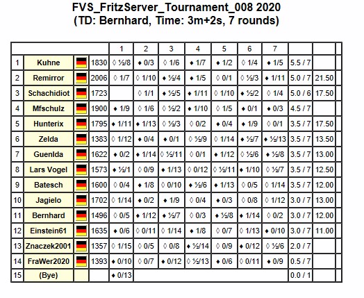 Am 8. Online-Turnier nahmen 14 Schachfreunde teil.