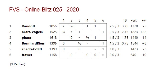 Am 25. Online-Turnier nahmen 6 Schachfreunde teil.