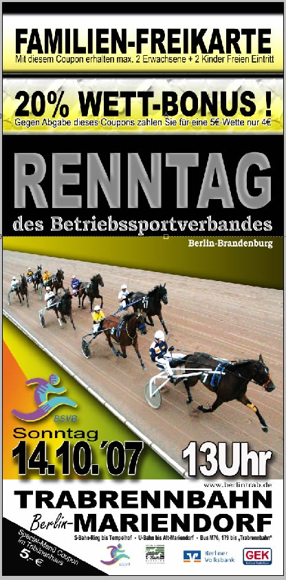 Trabrennbahn Mariendorf der Renntag des BSVB statt. Hier kann der Gutschein für den kostenlosen Eintritt heruntergeladen und ausgedruckt werden. |